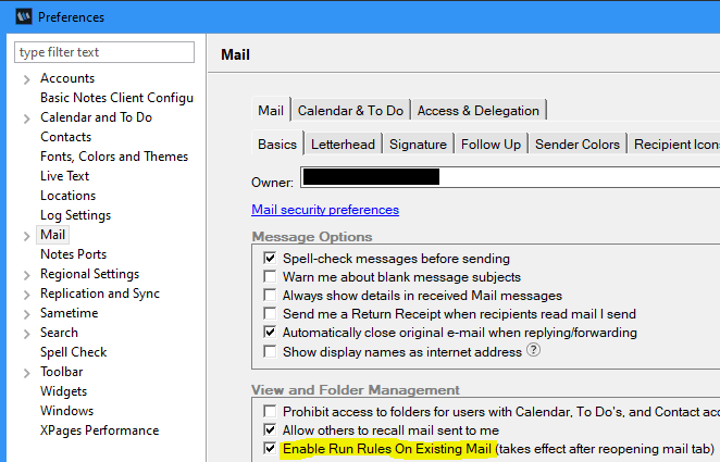 B. Open the Notes (Standard) client, then click Mail - Enable Run Rules on Existing Mail as seen below. Note: This setting can be automatically pushed out to all users via a Domino Mail Settings policy on a Domino Server 9.0.1 FP9 or higher.