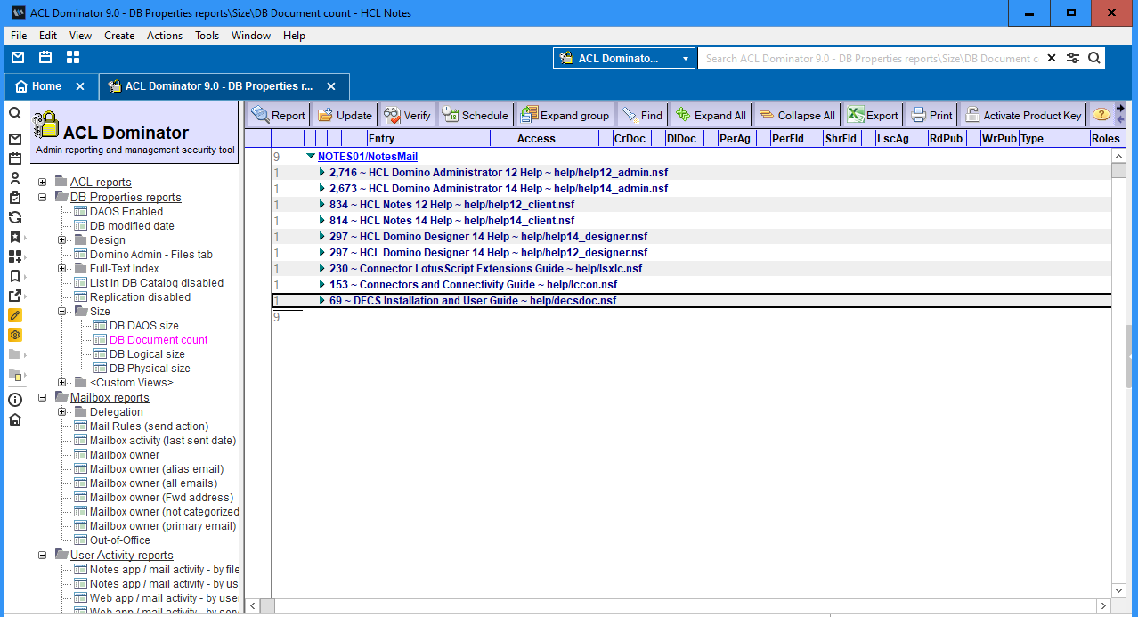 OFFERS MAILBOX / APPLICATION REPORTING TO DOMINO ADMINISTRATORS INCLUDING NESTED GROUPS, ACL SETTINGS, DB PROPERTIES, DAOS, MAILBOX PREFERENCES, USER ACTIVITY, MAIL RULES, EXCEL EXPORT